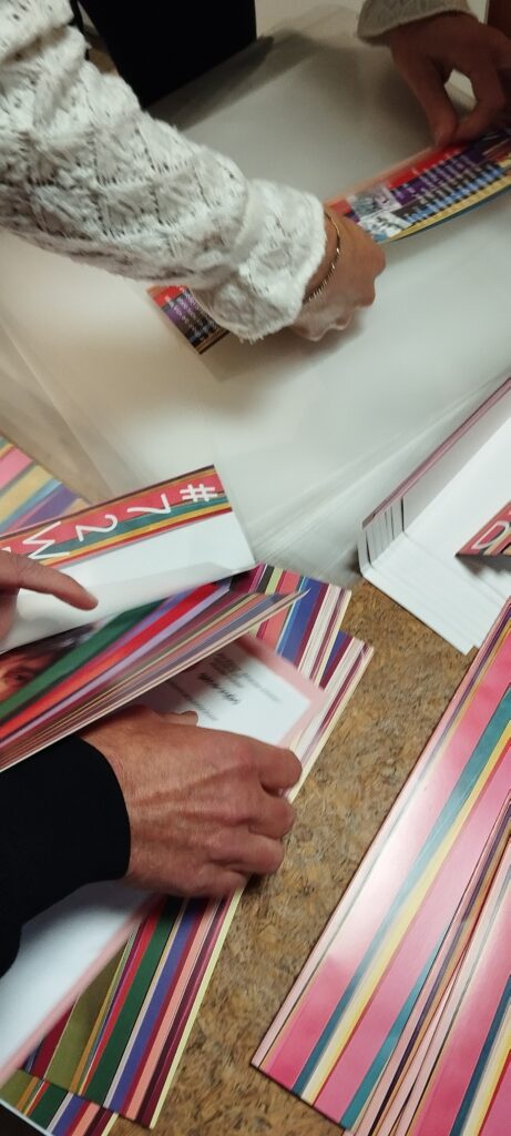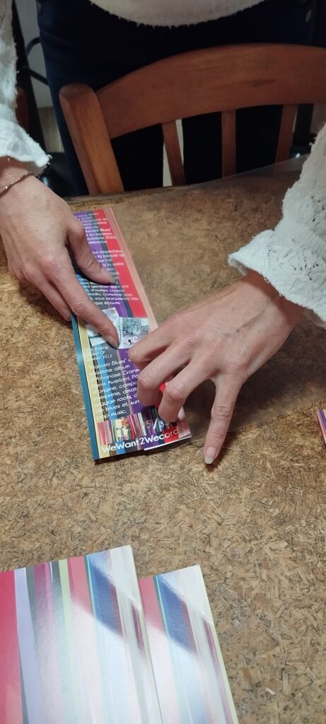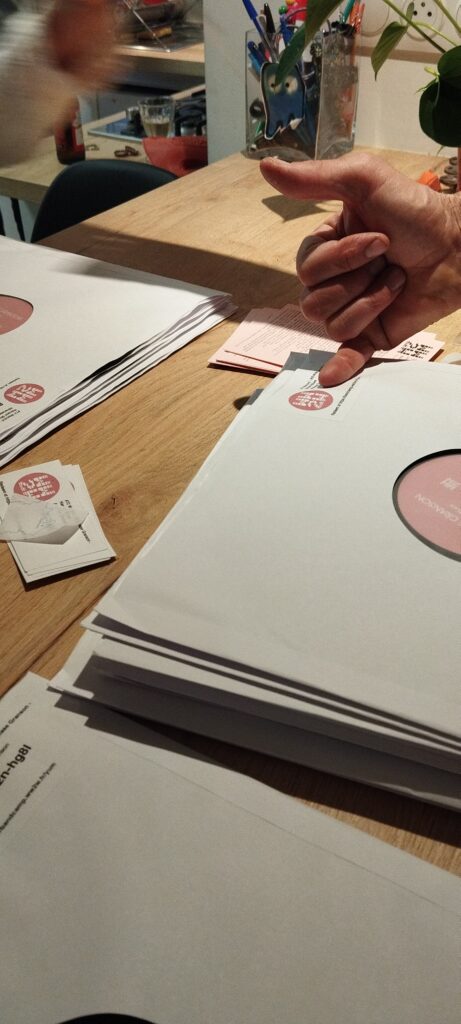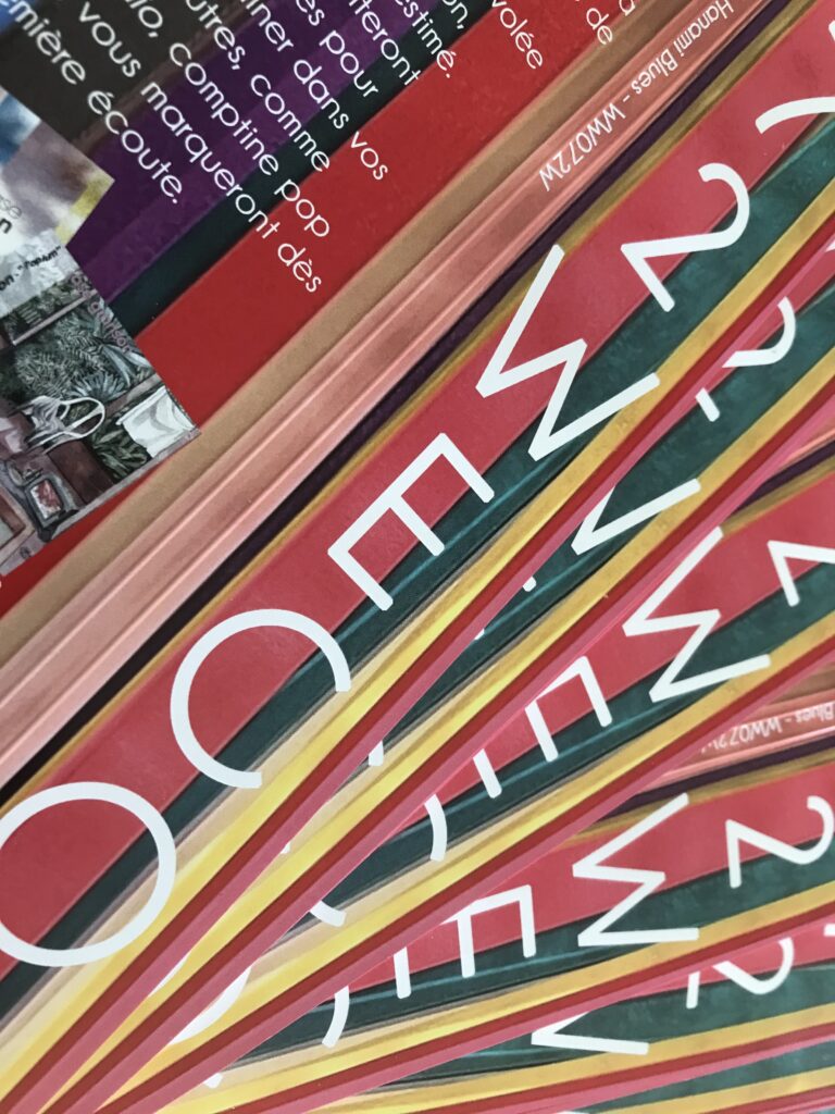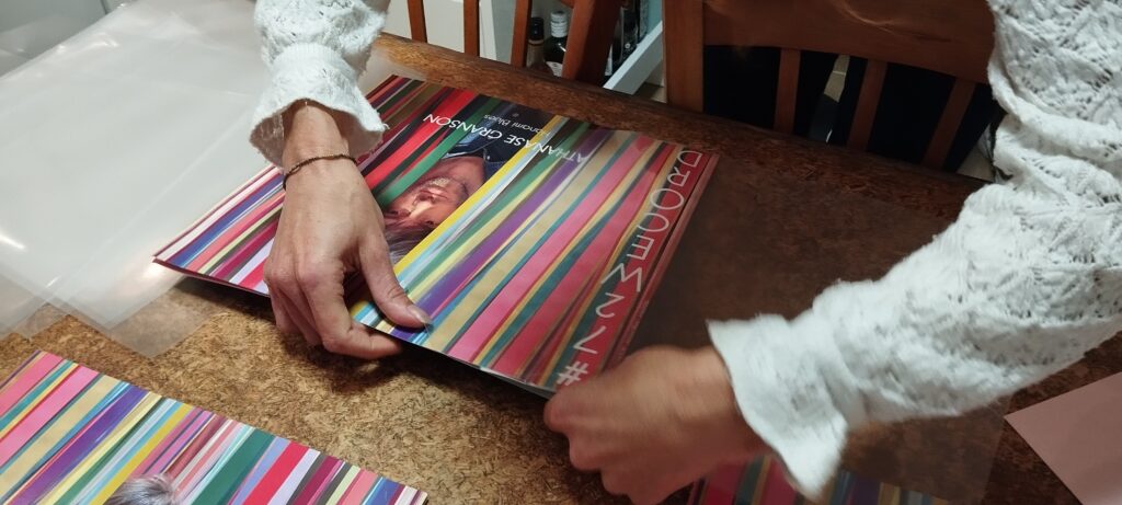 Pochette « poster » cartonnée pliée en deux, imprimée des deux côtés.